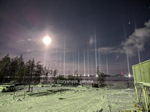 В Кобяйском улусе отфиксировали два необычных явления сразу — световые столбы и гало. Гиганткие небесные столбы сфотографировали и в с.Жиганск.