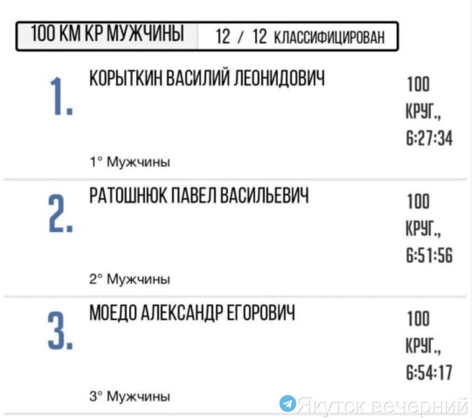 И вот выясняется, что на Кубке России по бегу на 100 км в Нижнем Новгороде Саша финишировал третьим! Его время – 6:54.17. Он уступил Павлу Рашатнюку 2 минуты 21 секунду, а первое место занял кемеровчанин Василий Корыткин (6 часов 27 минут 34 секунды).\