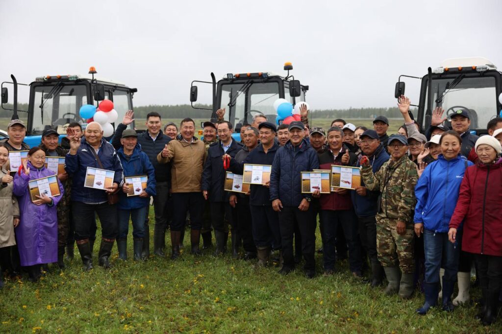 Рабочий визит начался с радостного события – 13 хозяйств улуса получили ключи от новой техники. Это три трактора «Беларус» МТЗ 82, 4 дисковых бороны, два прессподборщика, две зерновые сеялки, тракторная косилка, обмотчик рулонов и глубокорыхлитель. Это действительно знаменательный день в истории сельского хозяйства республики.