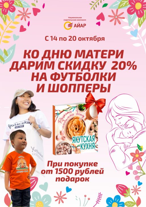 С 14 по 20 октября вы сможете воспользоваться скидкой 20% на стильные футболки с якутскими надписями и практичные шоперы. Это отличная возможность обновить свой гардероб или выбрать подарок для любимой мамы!