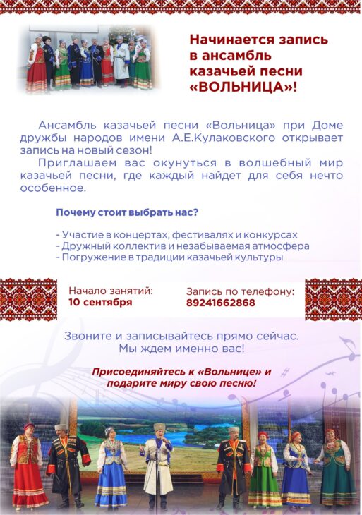 Ансамбль казачьей песни «Вольница» при Доме дружбы народов открывает запись на новый сезон.