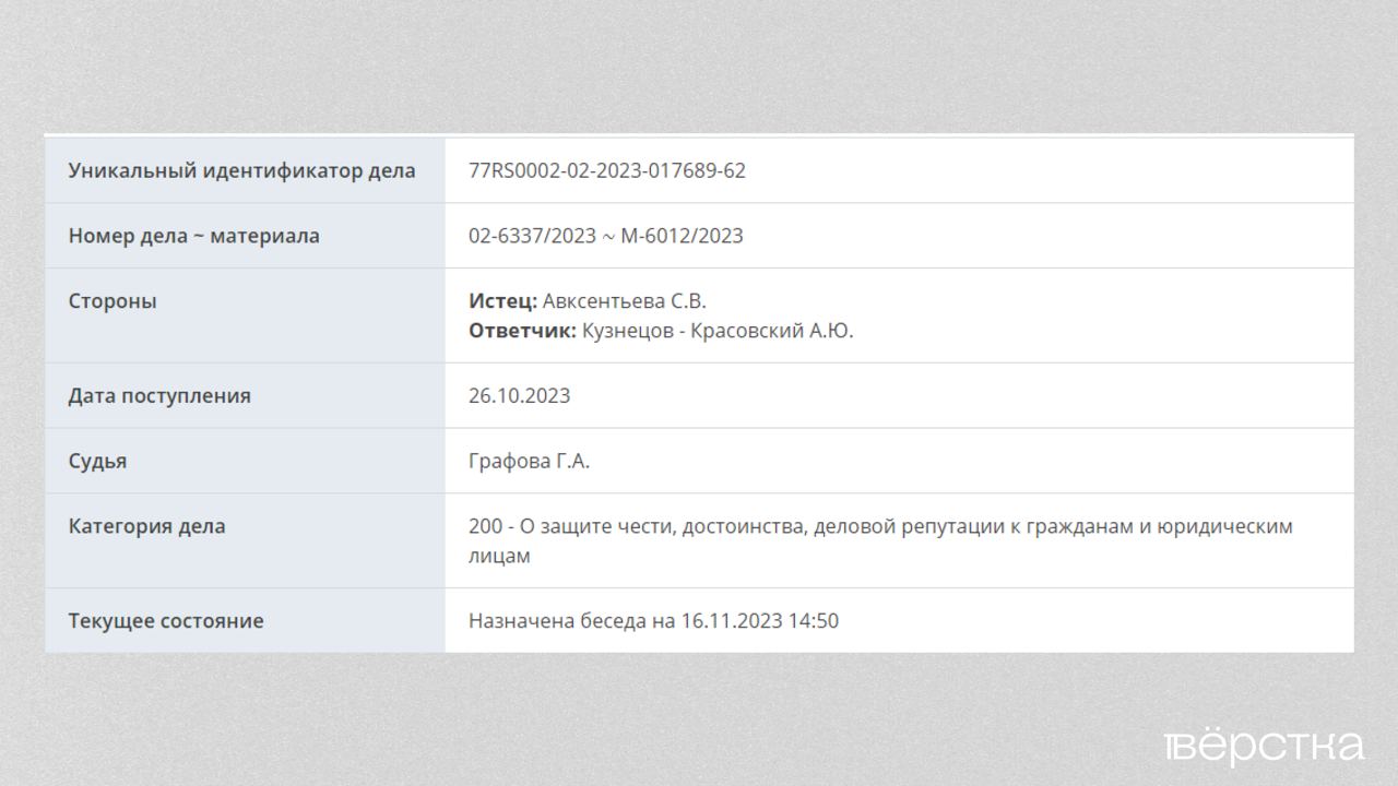 Авксентьева подала в суд иск на Красовского о защите чести и достоинства
