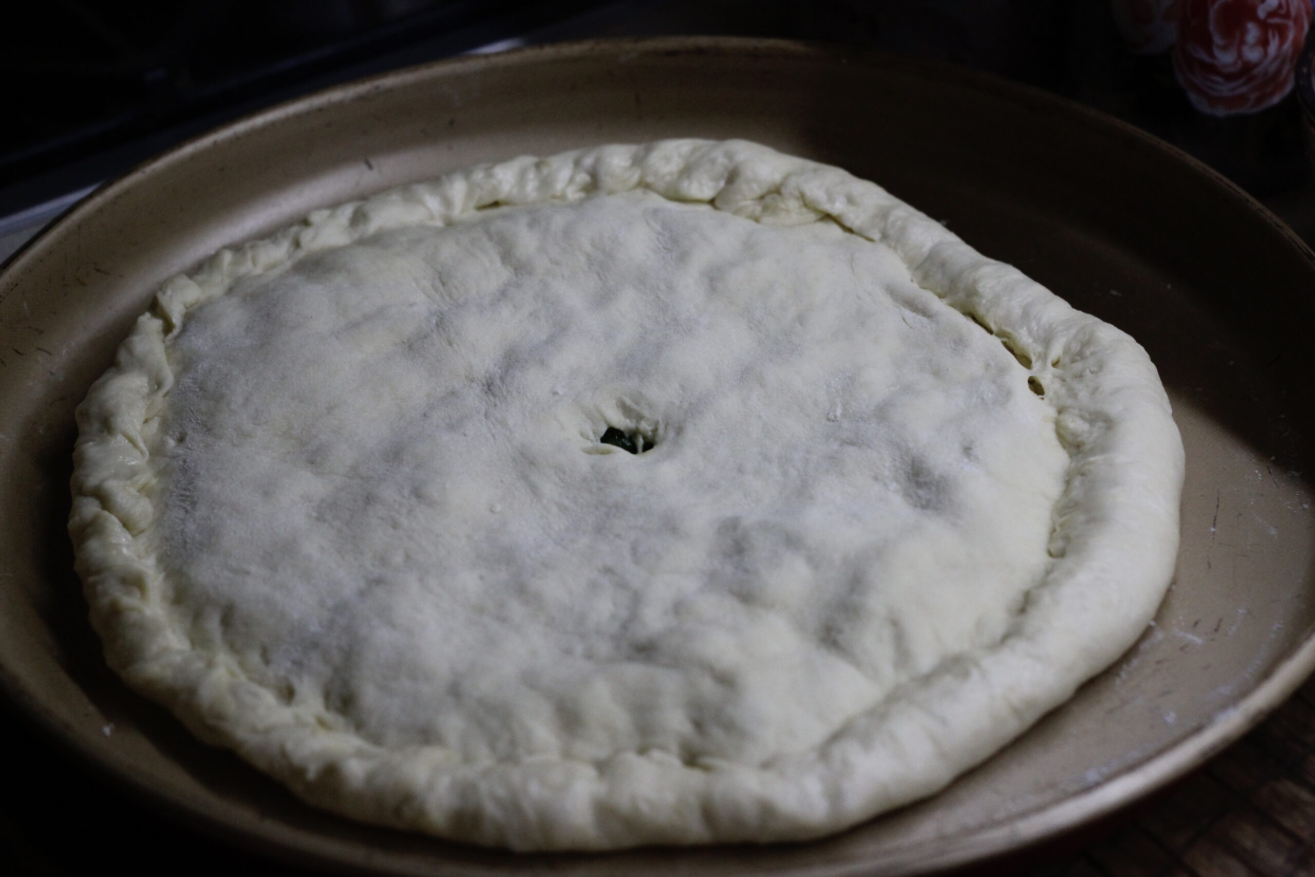 5. Раскатать вторую часть дрожжевого теста, выложить его на начинку и хорошенько скрепить края нижнего и верхнего слоя. Сделать небольшое отверстие посредине пирога, чтобы в момент выпекания лишняя жидкость испарялась из выпечки. Готовить пирог при 180 градусах до золотистого оттенка и сухого прокола шпажкой.