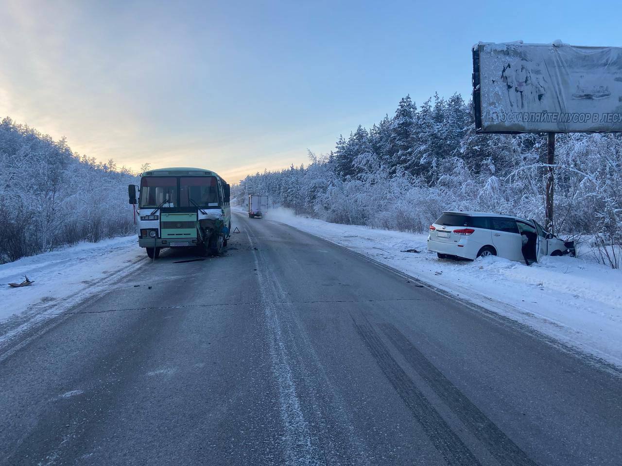По предварительным данным, на подъеме Вилюйского тракта водитель автомобиля «Тойота Виш» двигаясь со стороны г.Якутска, выехав на обгон транспортов, совершил столкновение с автобусом, который двигался со встречного направления. Сам водитель автомобиля, его пассажир и еще несколько пассажиров автобуса обратились за медицинской помощью.