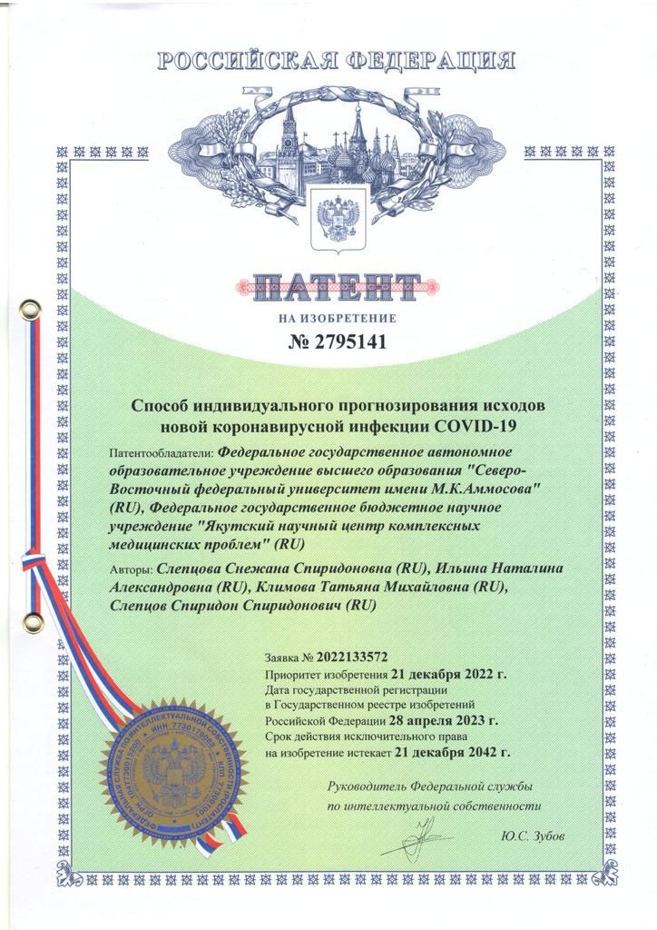Совместно с научным руководителем Снежаной Спиридоновной Слепцовой (д.м.н., профессор, заведующая кафедрой «Инфекционные болезни, фтизиатрия и дерматовенерология» Мединститута СВФУ им. М.К. Аммосова), соискателями Спиридоном Спиридоновичем Слепцовым (к.б.н., доцент, старший научный сотрудник лаборатории клинико-популяционных и медико-социальных исследований ФГБНУ «Якутский научный центр комплексных медицинских проблем») и Татьяной Михайловной Климовой (к.м.н., доцент кафедры фармакологии и фармации МИ СВФУ) 28 апреля 2023 года Наталине Александровне одобрен патент на тему «Способ индивидуального прогнозирования исходов новой коронавирусной инфекции COVID-19».