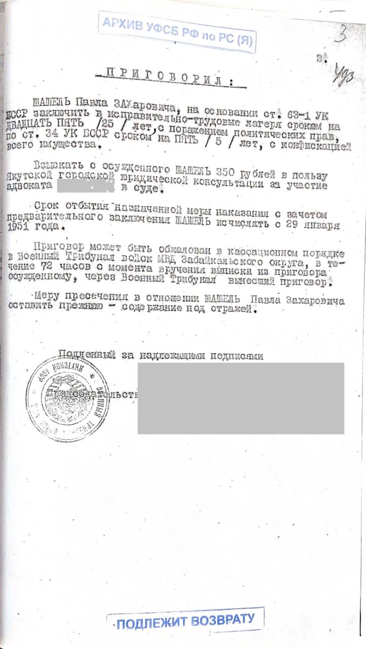 30 апреля 1951 года в Якутске был оглашен приговор Военного трибунала войск МВД Якутской АССР: «Именем Союза Советских социалистических республик подсудимый Шашель Павел Захарович, обвиненный в совершении преступлений, ст. 61-1 Уголовного кодекса Белорусской ССР (ст. 58-1 «а» Уголовного кодекса РСФСР) был приговорен к 25 годам лишения свободы с поражением в политических правах и конфискацией имущества».