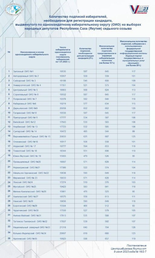 В числе подписей, должны быть 36 подписей депутатов представительных органов муниципальных районов и городских округов и (или) избранных на муниципальных выборах глав муниципальных районов и городских округов Республики Саха (Якутия).