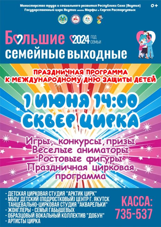 1️ июня в 14:00ч. в сквере цирка состоится праздничная программа совместно с Министерство труда и социального развития РС(Я). Вас ждут аниматоры, веселые игры и конкурсы с призами.