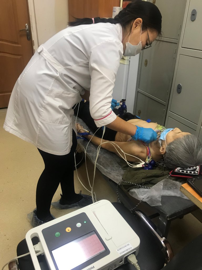 Иду по кабинетам. Врачи привезли с собой мобильное медицинское оборудование и расположились вполне комфортно. Сориентироваться легко – на дверях таблички с указанием специалистов. Ажиотажа нет, пациенты знают, к кому пойдут — записались заранее. У кабинета, где устроились врач УЗИ и ее медсестра, оживленно. В кабинете рядом работает электрокардиограф. В самом большом кабинете (актовом зале) ведут прием четыре специалиста: врачи кардиолог, ревматолог, эндокринолог, окулист, желающих получить консультацию много.