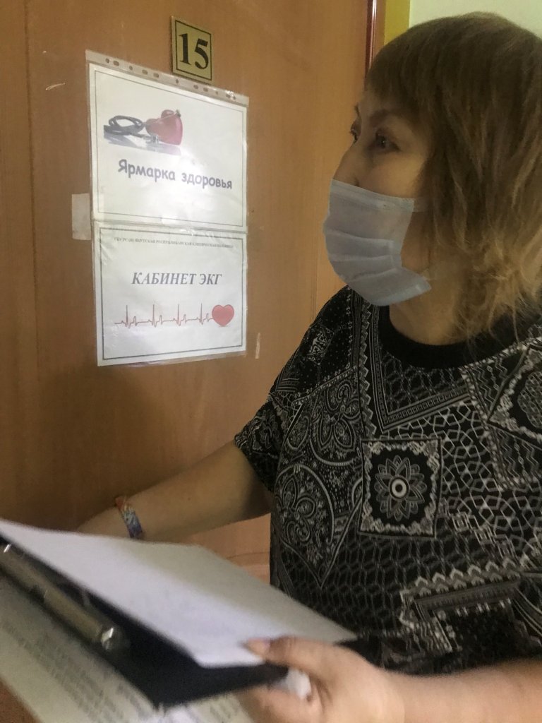 — Хотим попасть к кардиологу, сделали кардиограмму, УЗИ сердца, — делятся две женщины, сидящие у кабинета, где ведет прием врач-кардиолог.