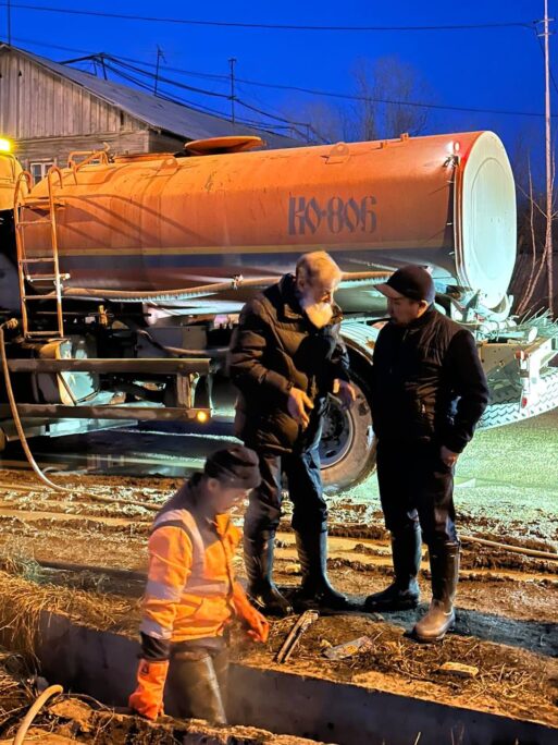 Вчера вечером с Егором Ефимовичем Кардашевским были на улице Пионерская, где затопило ряд многоквартирных жилых домов. Работники «Якутдорстроя» откачивают талые воды и днем, и ночью.