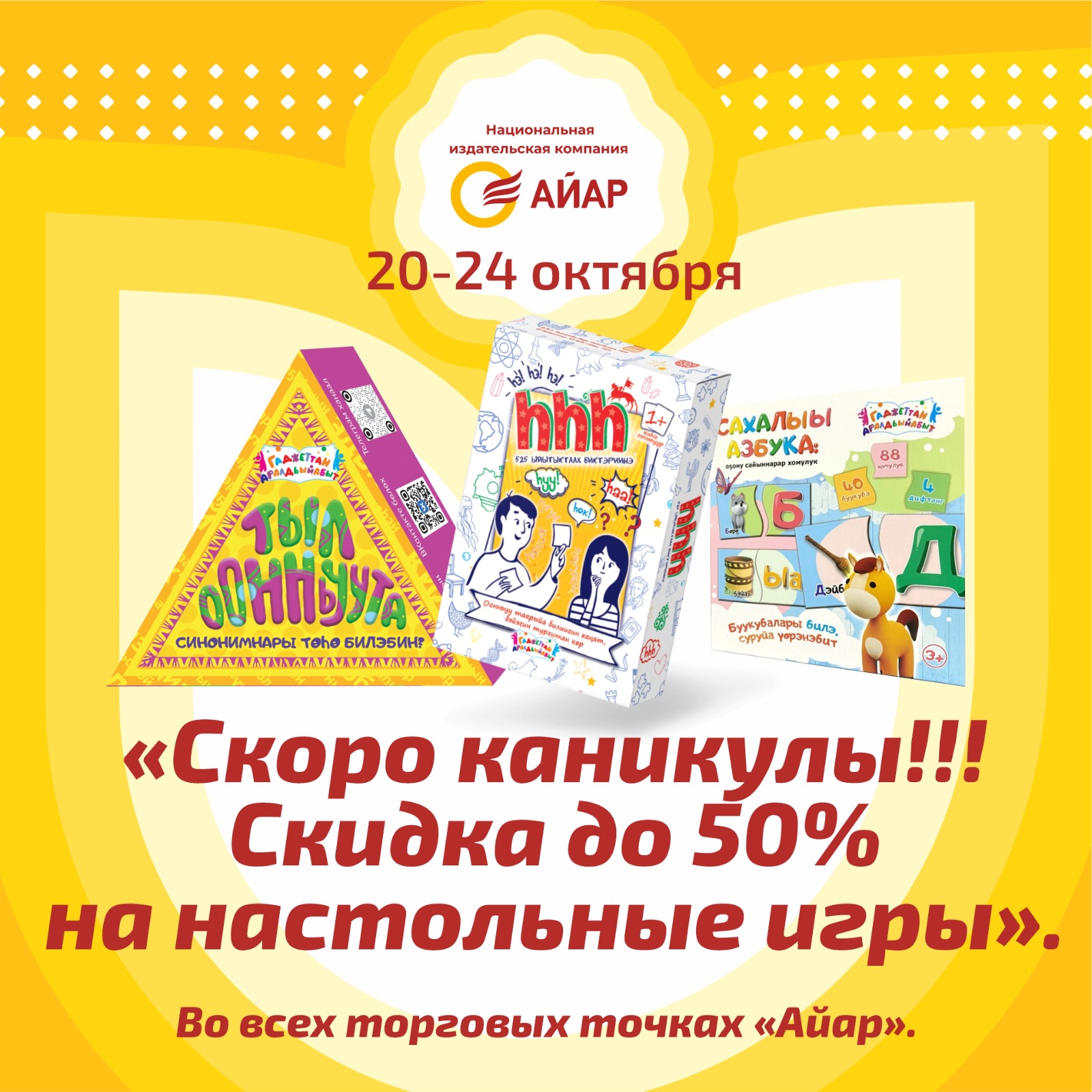 Долгожданные каникулы уже на пороге! Время для отдыха, веселья и новых впечатлений! А чтобы сделать эти дни по-настоящему яркими и незабываемыми, специалисты магазинов «Айар» подготовили для вас особое предложение. С 20 по 24 октября 2025 года в наших магазинах действуют невероятные скидки – до 50% на широкий ассортимент настольных игр, пазлов и гербов улусов!