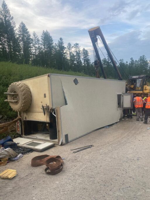 В результате происшествия два пассажира большегруза : мужчины 1967 г.р. и 1990 г.р. были доставлены попутным транспортом в Алданскую больницу, где после осмотра дежурным врачом 32-летний пострадавший был госпитализирован в травматологическое отделение. В момент ДТП пассажиры были пристегнуты ремнями безопасности.