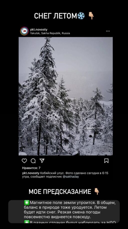 Экстрасенс из Якутии Мария Сырдык опубликовала еще одну порцию своих сбывшихся предсказаний в своем тгк Сырдык Куус — снег летом и вспышках энергии Солнца.
