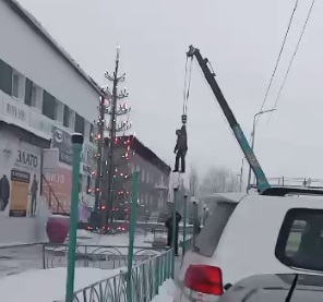 Кадры украшения ретро-ёлки рядом с ТЦ “Эдем” в городе Покровске Хангаласского района завирусились в соцсетях сегодня утром. По словам владельца торгового центра, на кран подвесили профессионального альпиниста Сергея Хренова, сообщает тгк Кровавая барыня.