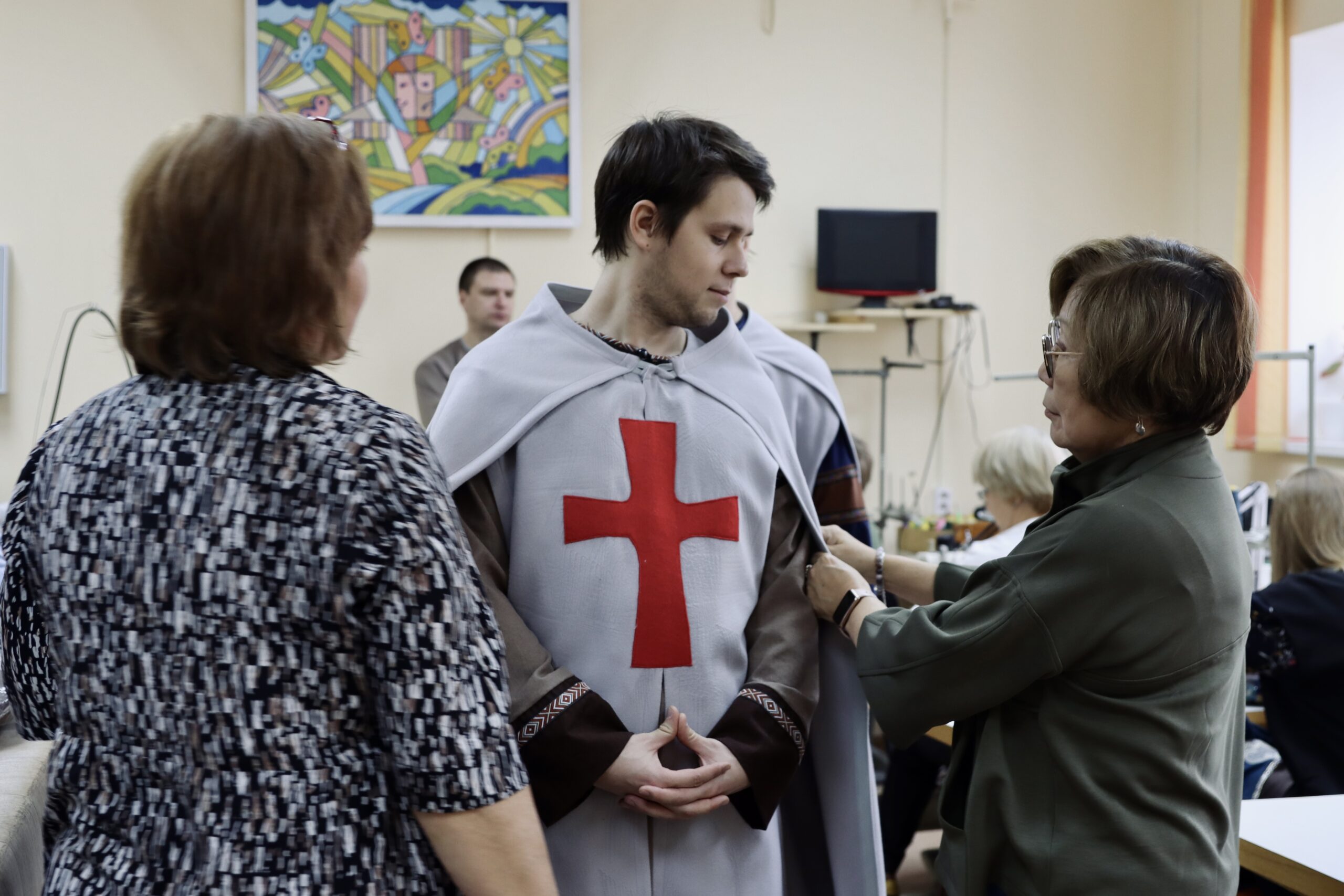 Большой объем работы был и у столярного и декорационного цехов. Массивные каркасы, обшивались фреской, которая имитирует рисунок с храма, где покоились мощи Невского. Созданы детали быта для передачи атмосферы Древней Руси.