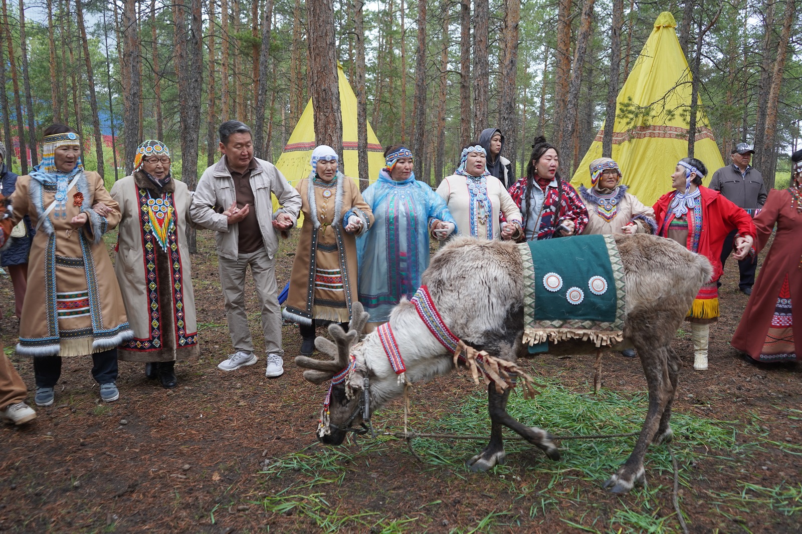 Центральным моментом праздника стал обряд благословения оленей, который провела обрядовая группа Союза эвенов во главе с Антуанеттой Абрамовой, руководителем этнофольклорного ансамбля «Долгунча». Дорогу осыпали зеленой травой — пожелание плодовитости и здоровья оленьим стадам. В знак благодарности за их роль в жизни народа оленей украсили праздничным убранством, поднесли ягель, соль, молодую траву и провели по почётному кругу под восхищенные взгляды гостей.
