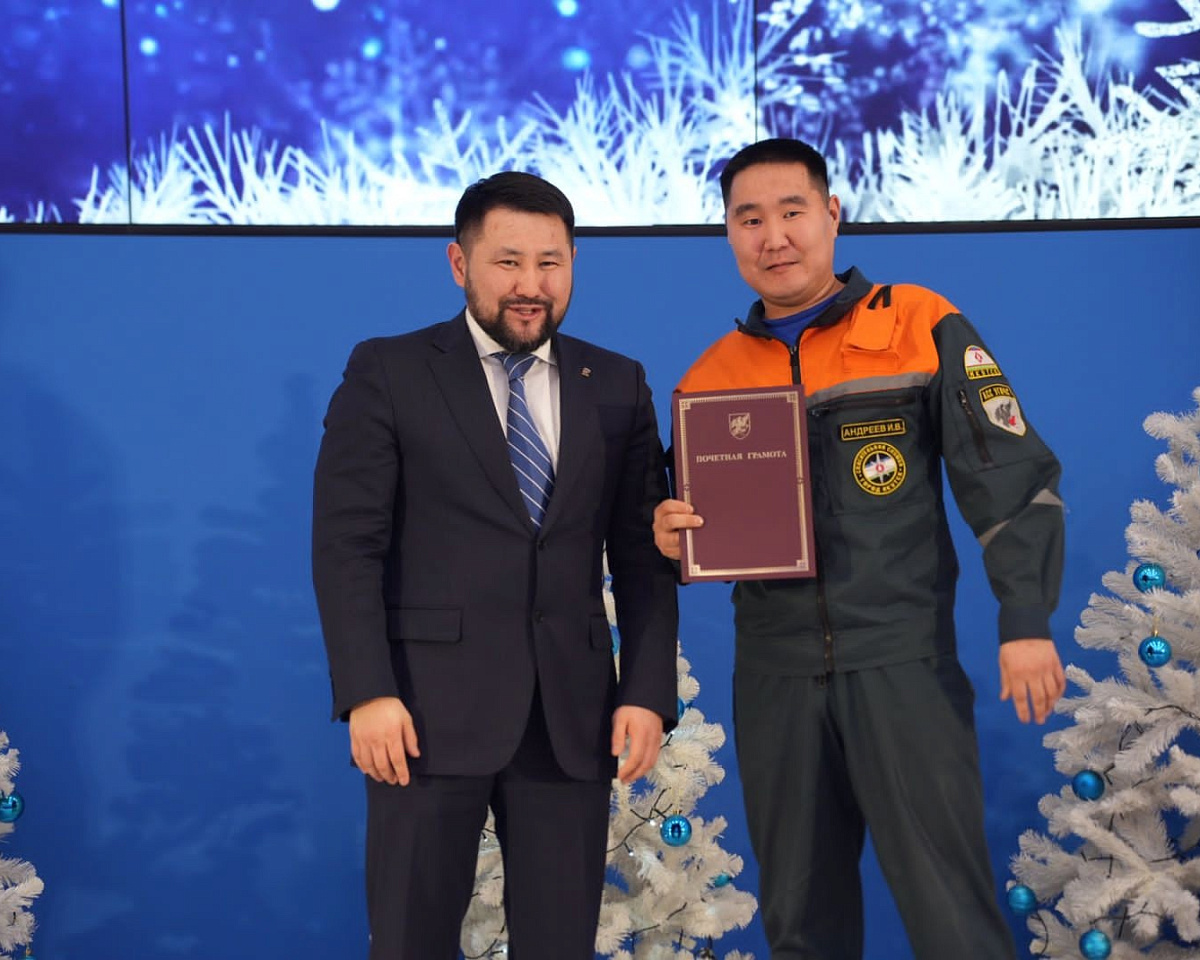 Почетной грамотой Окружной администрации города Якутска награжден спасатель аварийно-спасательной службы МКУ УГО ЧС ГО «город Якутск», спасатель второго класса Илья Андреев, директор предприятия ООО «Тутту Саха» Нюргун Саввин.