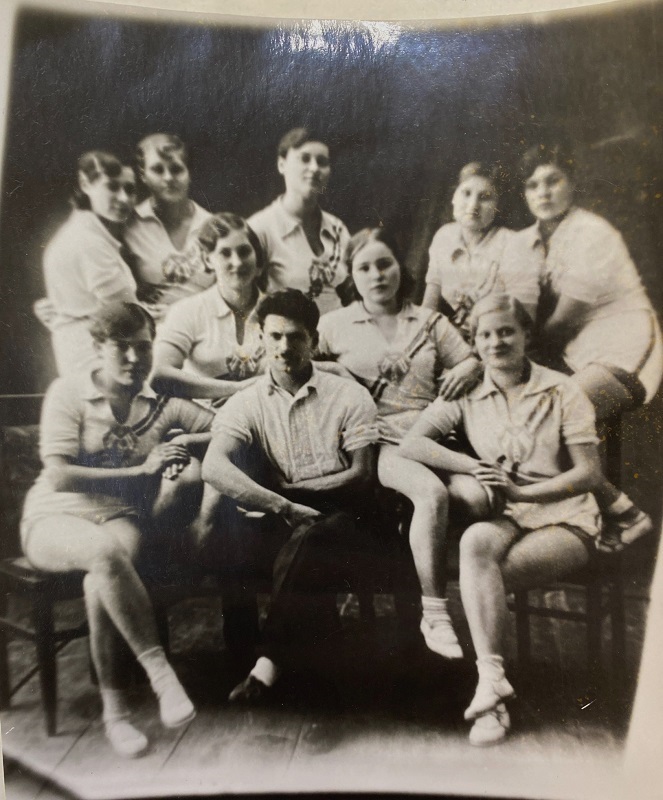 Группа моих девушек-гимнасток 1938-1941 гг. В Якутской фельдшерско-акушерской школе, которая часто выступала на вечерах в своей школе и на городских вечерах, конференциях. За мной вверху в центре – Ира Каллистратова, в середине слева от меня – Иванова, справа – Смирнова, в первом ряду слева – Козлова. Фамилии остальных забыл. Сфотографировано в декабре 1938 года перед выступлением на новогоднем вечере в городском театре (аннотация Е.К. Суровецкого).
