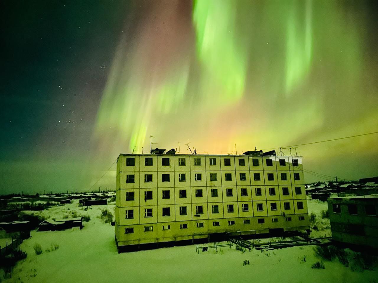 Пока в Якутске играет огнями обновленная площадь Ленина, в Нижней Колыме свою иллюминация — небесная. Сполохи северного сияния осветили микрорайон Зелёный Мыс, Нижнеколымский улус, сообщает тгк @kpcher