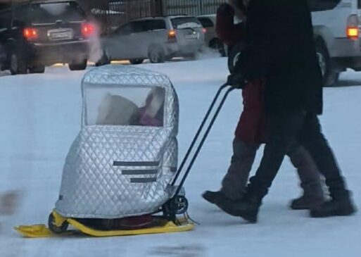 Якутские морозы толкают местных жителей на новые подходы в утеплении. Портативные гаражи «наташи» уже прочно вошли в жизнь якутян. Но некоторые решили применить новые технологии для других видов «транспорта». В мессенджерах активно распространяется фото находчивых родителей, которые сшили портативный гаражик для санок или снегохода, чтобы с комфортом и в тепле отвозить детей в садик.