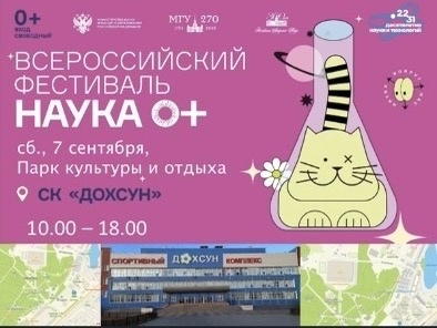 Приходите в субботу в СК Дохсун парк культуры и отдыха в спортивный комплекс Дохсун для участия в Фестивале науки 0+ с 9.00 до 18.00