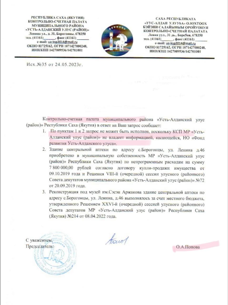 Каково было удивление депутатов, когда они получили ответ от Контрольно-счетной палаты Усть-Алданского улуса за подписью Поповой Ольги, то есть экс-руководителя Фонда развития Усть-Алданского улуса, что контрольный орган вообще не располагает никакой информацией об этом Фонде…