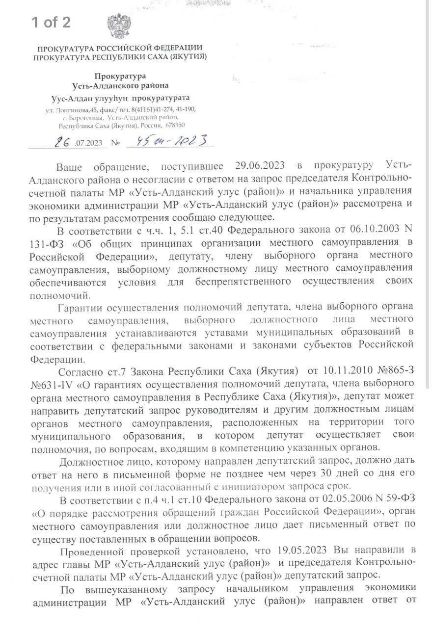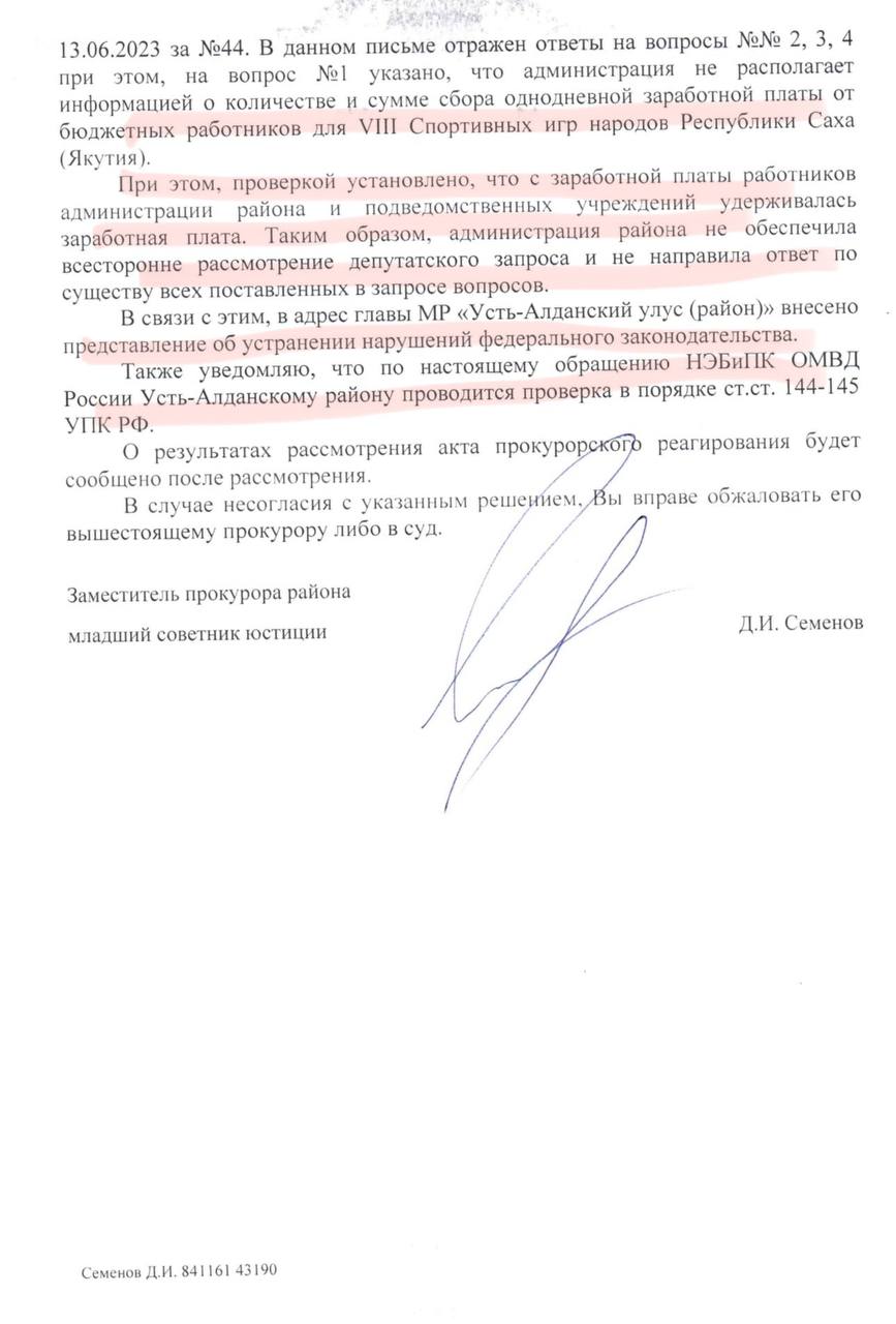 В июле 2023 года в дело вмешалась районная прокуратура, которая подтвердила, что сборы однодневной зарплаты осуществлялись как с работников районной администрации, так и с подведомственных учреждений, поэтому глава улуса должен знать ответ на вопрос депутата, сколько именно миллионов рублей ушло в Фонд от бюджетников.