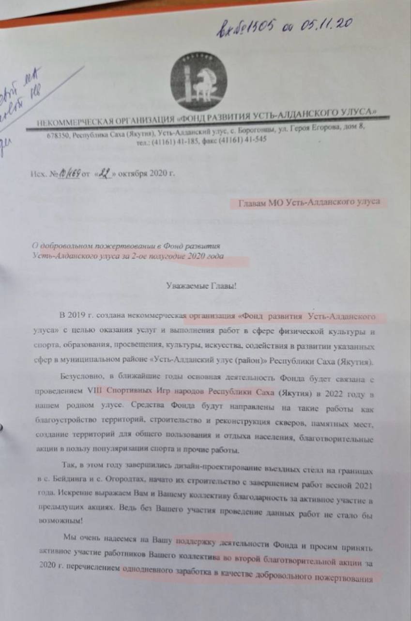 Далее всем главам муниципальных образований Усть-Алданского улуса полетели «письма счастья» с просьбой добровольно пожертвовать однодневный заработок в пользу Фонда со ссылкой на предстоящие спортивные Игры народов Якутии.