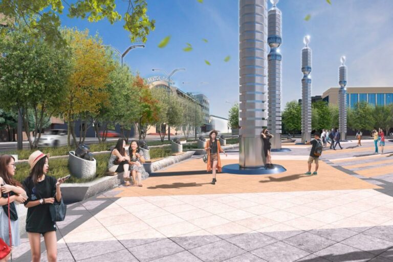 Реконструкция площади включает в себя озеленение, мощение проездов и тротуаров, установку пешеходного сухого фонтана и 13-ти метровых колонн в виде якутской коновязи — сэргэ.