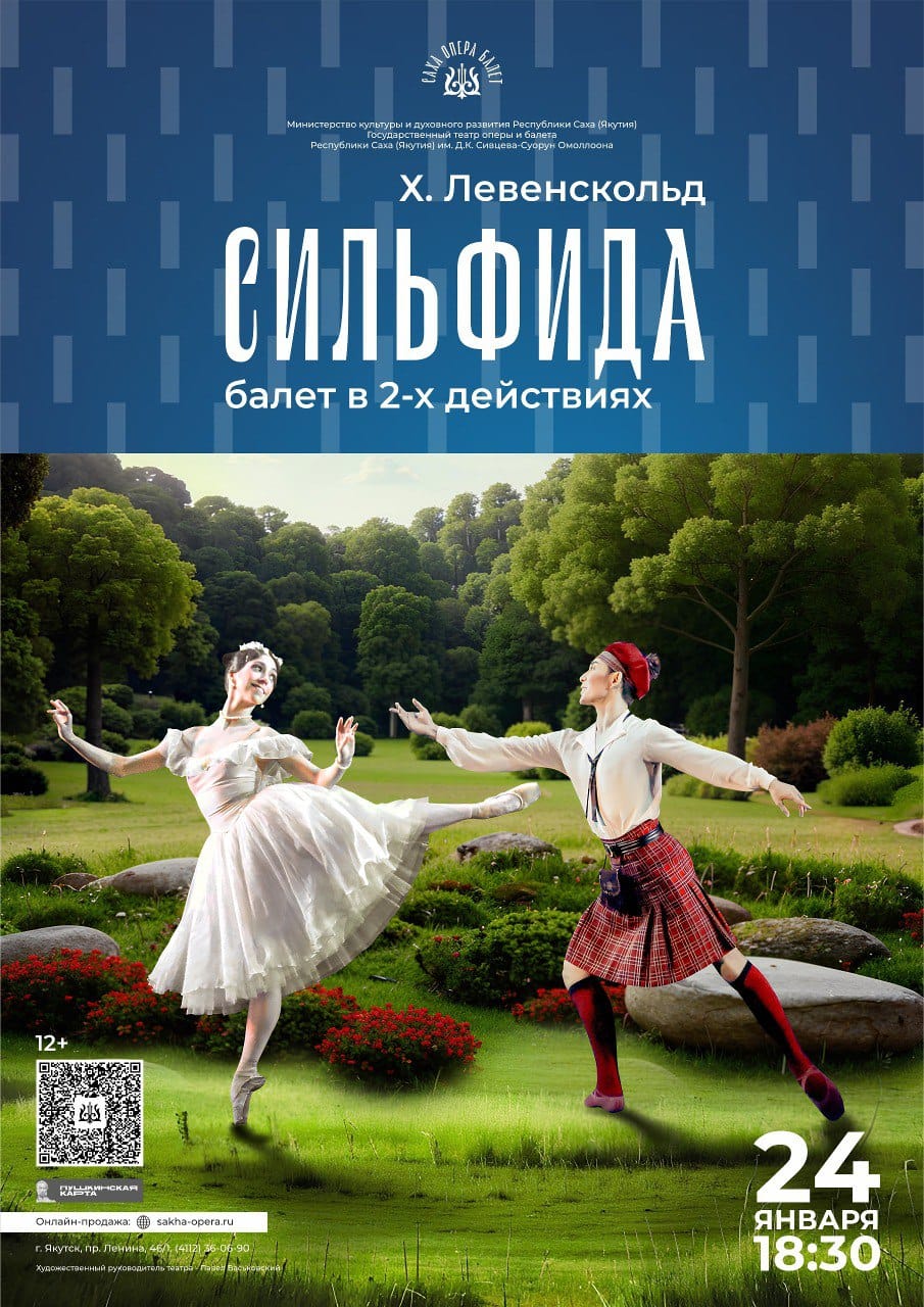 — А давайте скажем о том, что сюжет основан на фантастической новелле французского писателя Шарля Нодье «Трильби». В ней молодой художник по имени Джеймс влюбляется в загадочную и прекрасную сильфиду, олицетворяющую дух воздуха. В нашем случае Джеймса танцует Сарыал Афанасьев — вы всё время танцуете Сильфиду в паре с ним?