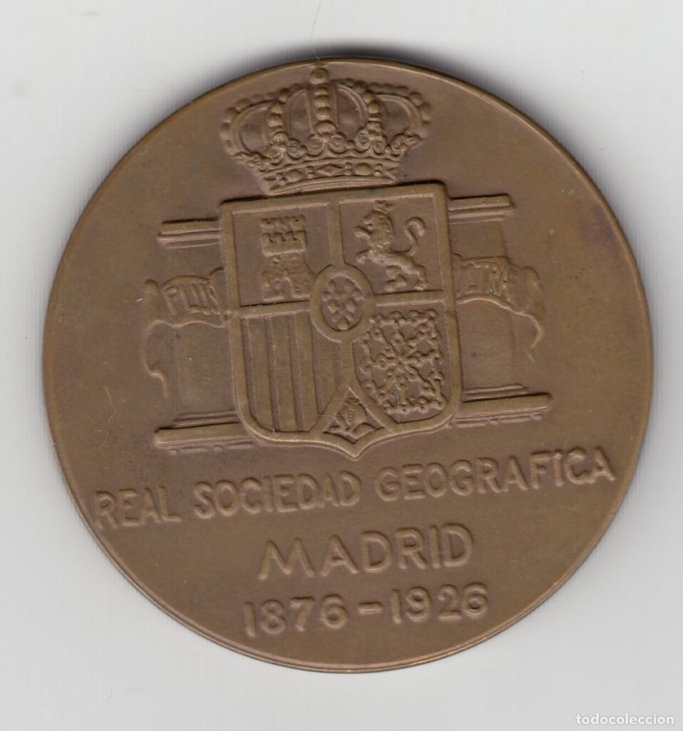 О медали: Медаль испанская, Королевского географического общества, 42 мм в поперечнике, состав: позолота, бронза и эмаль. На позолоченном медальоне:«Испания» представленная в женском образе, сидящая с глобусом у Геркулесовых столбов и указывающая на корабль в море. По краю медали расположен девиз на латыни:«PRIMUS — ME – CIRCUMDEDISTI» — «Ты первым обогнул меня»(в завершение экспедиции Магеллана император Карл V пожаловал капитану Хуану Себастьяну Элькано дворянство и присвоил личный герб, на котором в числе прочего был изображён земной шар с девизом Primus circumdedisti me (по всей видимости, именно это послужило источником девиза Общества в дальнейшем) на синем круге белая кайма с волнами и башенная корона. На темляке с защелкой для петлиц[9][10].