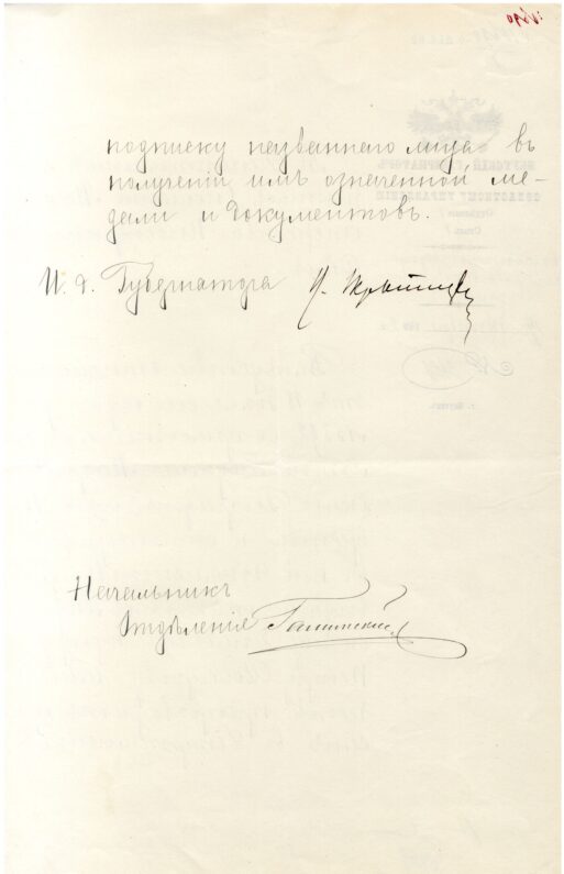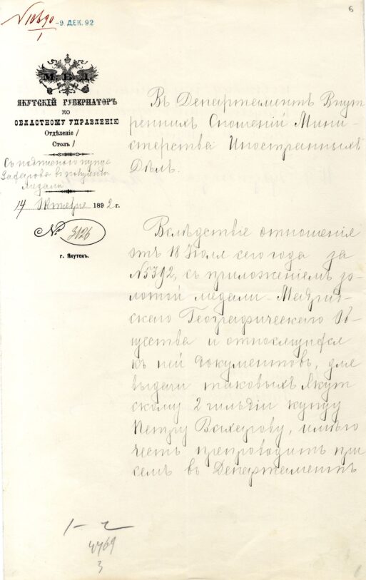 14 октября 1892 г. № 3126 отношение исполняющего обязанности Якутского губернатора в «Департамент внутренних сношений» МИД о направлении расписки купца 2-й гильдии П.И. Захарова в том, что он получил золотую медаль и полагающиеся к ней документы Мадридского географического общества: