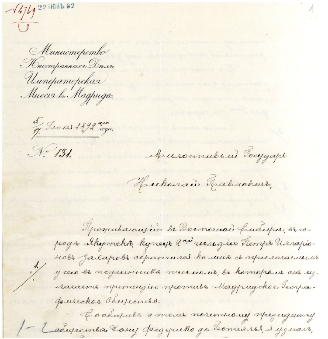 5/17 июня 1892 г. № 131 донесение чрезвычайного посланника и полномочного министра России в Испании М.А. Горчакова товарищу министра иностранных дел России Н.П. Шишикину по поводу направления в МИД для передачи якутскому купцу П.И. Захарову золотой медали и патента Мадридского географического общества:
