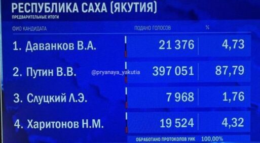 Аналитики отмечают высокий процент за Путина по республике, и считают, что Якутия отныне не цитадель оппозиции, как считалось ранее.