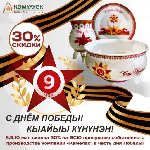 Компания «Камелёк» поздравляет якутян с наступающим Днем Победы и сообщает, что только ТРИ ДНЯ-8,9,10 мая 2024 года в фирменных магазинах якутской национальной посуды и сувениров @kamelek888 СКИДКА 30% на весь ассортимент