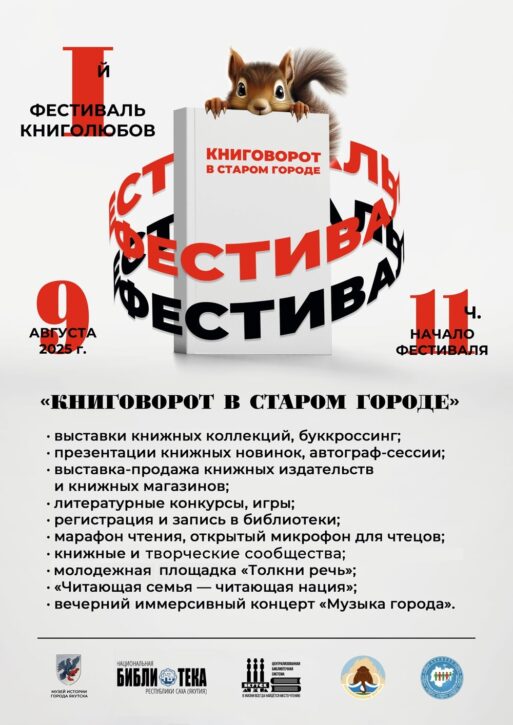 9 августа 2025 г. приглашаем всех ценителей книг принять участие в 1-м фестивале «КНИГОВОРОТ В СТАРОМ ГОРОДЕ». Проект — инициатива музея истории города Якутска и книголюбов г.Якутска.