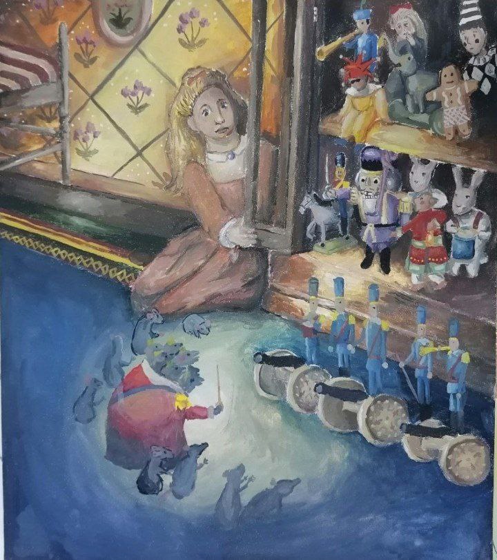 Это Светлана БОРИСОВА, учащаяся ДШИ имени Л.А.Кима. Ей 13 лет, и она нарисовала интересную картину, где бессовестные мыши во главе с мышиным королём объявили войну Машиным игрушкам.