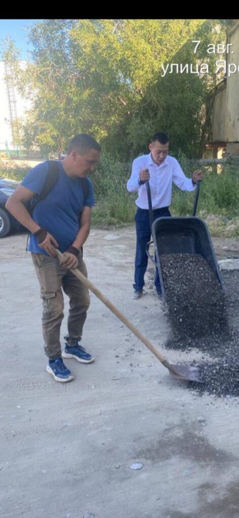 Сотрудники Управы центрального округа Якутска, вместо выполнения своих прямых служебных обязанностей, в белых рубашках и кроссовках белого цвета, якобы занялись ямочным ремонтом, о чем выложили фотографии в своем телеграм-канале…