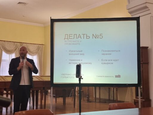 В живой, непосредственной форме они обсудили вопросы культуры массовых коммуникаций и предложили участникам встречи игровой практикум на тему «Интервью как кросс-культурная коммуникация: ТОП-5 кейсов журналиста».