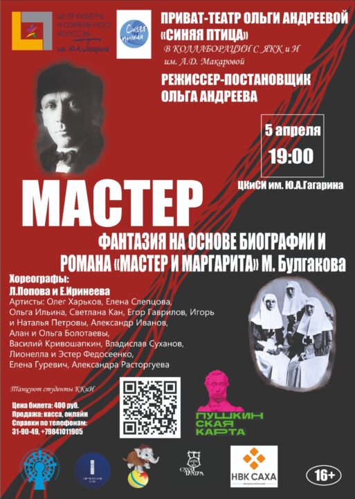 Спектакль «Мастер» создан на основе биографии и романа «Мастер и Маргарита» Михаила Булгакова. Сценарий написан руководителем Приват-театра Ольги Андреевой «СИНЯЯ ПТИЦА» и ею же осуществлена постановка. Спектакль создан в коллаборации с Колледжем культуры и искусств им. А. Д. Макаровой. Всего задействовано 32 участника. Для создания сценария использованы дневники, письма, воспоминания современников, много фактов из жизни выдающегося писателя, которые мало известны широкому кругу.