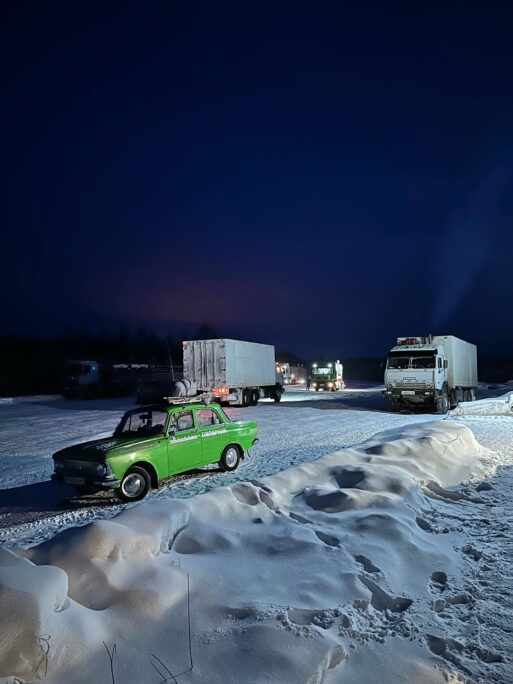 Грузовики — основной транспорт, который идет по зимнику. В этот раз их было достаточно мало. А легковые машины встречаются совсем редко, мы заметили всего две.