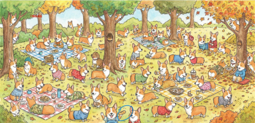 У собачек корги проходит пикник на свежем воздухе. Эти собачки так похожи на булочки. Кстати, ваша задача — найти булочку за 10 секунд! Справитесь?