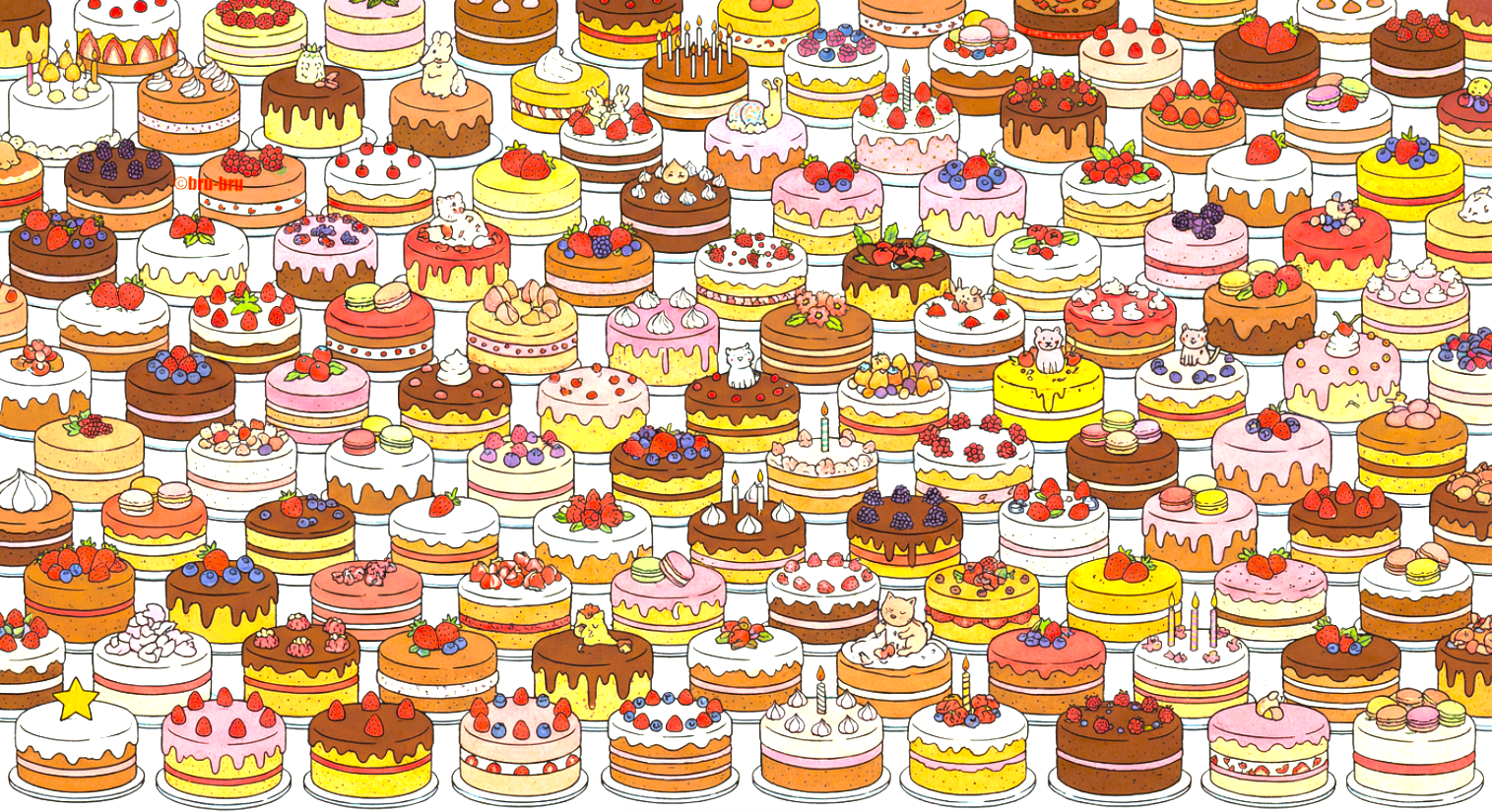 Кто-то испёк множество разнообразных тортов! Тут тебе и ягодные тортики, и шоколадные, и даже с украшением в виде макарон. Ваша задача — найти тортик с украшением в виде звезды! Даём на поиски 10 секунд! Справитесь?