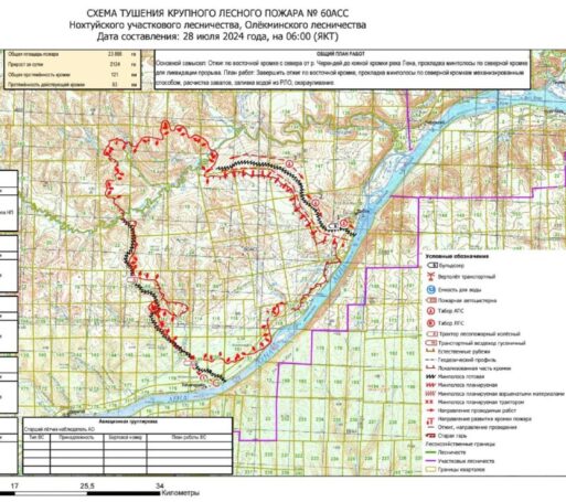 В Олекминском районе сегодня ликвидирован один из самых крупных лесных пожаров с привязкой к селу Дабан, который действовал с 3 июля на площади более 25 тысяч гектаров на расстоянии 14 километров от села. На схеме тушения пожара от 28 июля можно увидеть и оценить масштаба этого пожара.