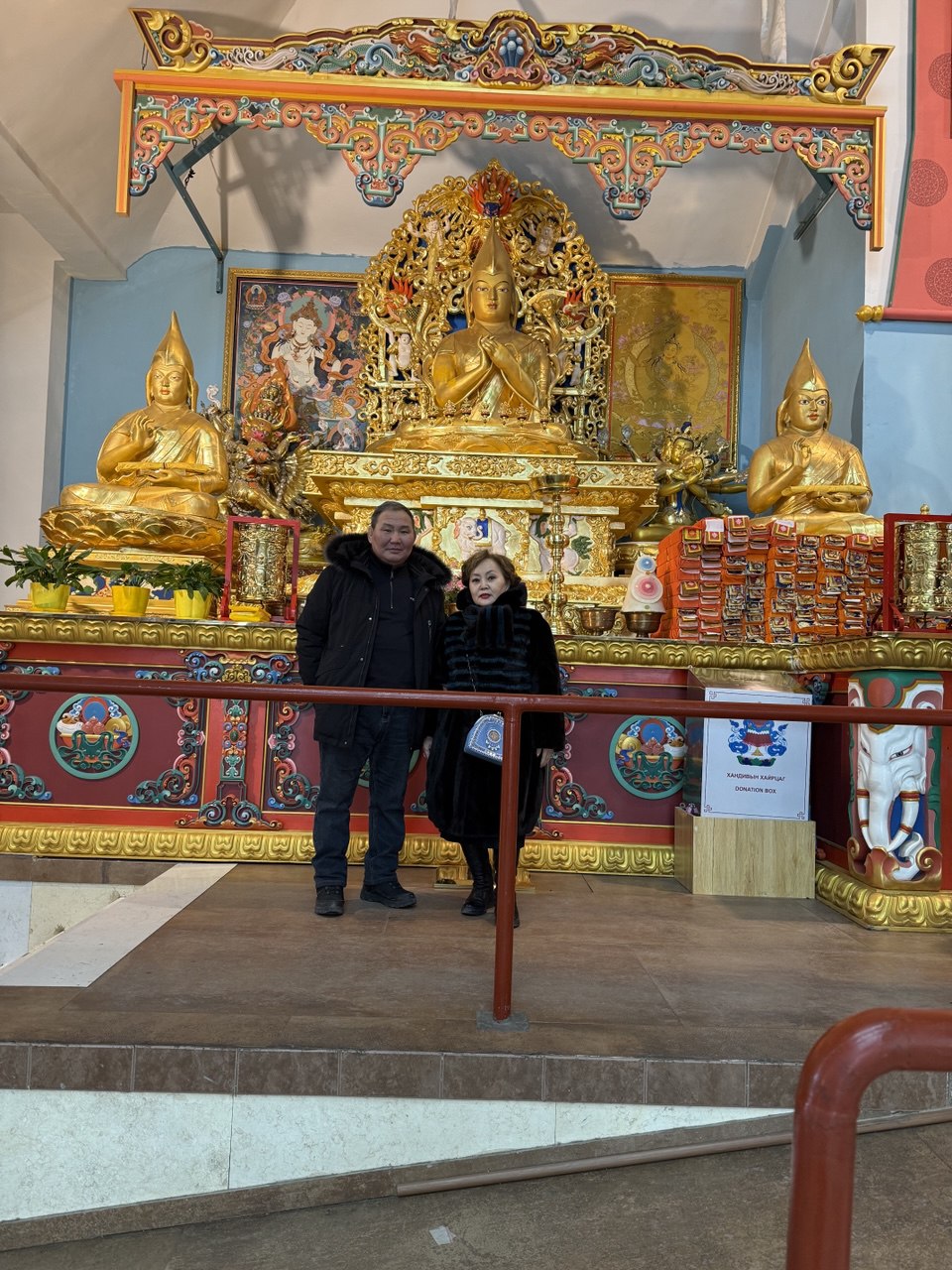 В завершающий день Оюуна повела нас в Центральный буддийский храм. Он является государственным и был построен в 2022 году на пожертвования народа. Рядом с этим новым Дацаном расположен целый комплекс других Дацанов, построенных в разные годы. Но со слов Оюуны, этот Центральный храм один из самых красивых, просторных и величественных. Дацан действительно потрясает своим роскошным видом, особенно богатым убранством центральной группы буддийских идолов. Но красота этого храма не в сосредоточении в нем золота и драгоценных каменьев, а в искусно выполненных деталях буддийских атрибутов — это и прекрасные резные этнические узоры, выполненные из дерева, это и декоративные гобелены с изображением буддийских символик и самое главное — это главная статуя Будды, с обеих сторон которой находятся статуи других будд и бодхисаттв — просветлённых существ, которые посвятили себя помощи всем живым существам на пути к просветлению.