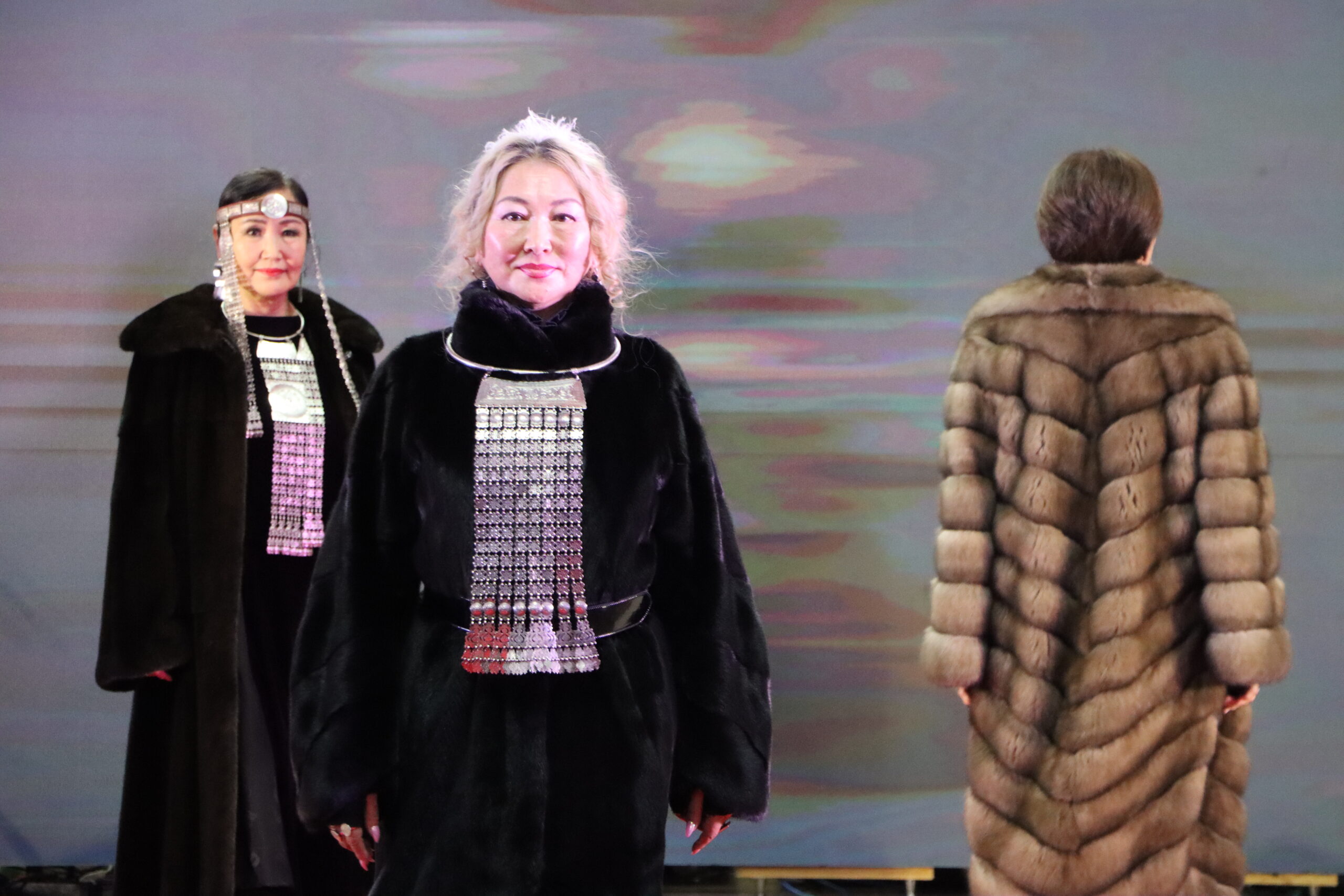 Затем прекрасные модели показали изделия ведущих ювелирных предприятий Якутии: “Киэргэ”, “Уруу”, “Ohуор утум”, “Саха таас” и Мастерской Петра Алексеева. И притом по дорожке прошлись и блеск якутских украшений показали не только юные красавицы, но и дамы более старшего возраста, которым действительно к лицу и фигуре наши богатые серебряные украшения илин-кэлин кэбиһэр или изысканные ювелирные изделия. Кстати, среди моделей, демонстрировавших изделия фирмы “Киэргэ” и мехового салона “Zima”, была замечена Лена Егорова, специально приехавшая из Монголии по приглашению своего наставника Айала Корякина.