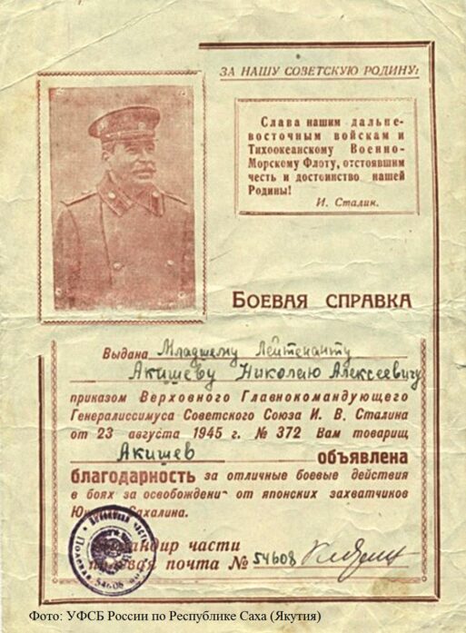 «Бригада вела боевые действия по освобождению юга Сахалина и Курильских островов. На острове Уруп мне пришлось принимать участие в работе оперативной группы по захвату и обезвреживанию японских диверсантов, проводивших массовые поджоги зданий и сооружений в порту. Обезвреживание диверсионных групп не обходилось без жертв с нашей стороны, но судьба проявила ко мне благосклонность, несмотря на то, что не раз моя жизнь держалась буквально на волоске. На Урупе никогда не бывало хорошей погоды: зимой обвалы сменяли метели и бураны, летом – морские тайфуны, ураганы и землетрясения, во время которых погибли много солдат и офицеров. Здесь я прослужил больше двух лет, здесь для меня закончилась война…», — делился Николай Алексеевич.