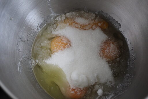 1. Для начала следует взбить до плотной светлой массы охлажденные яйца с солью, ванилью и сахаром.