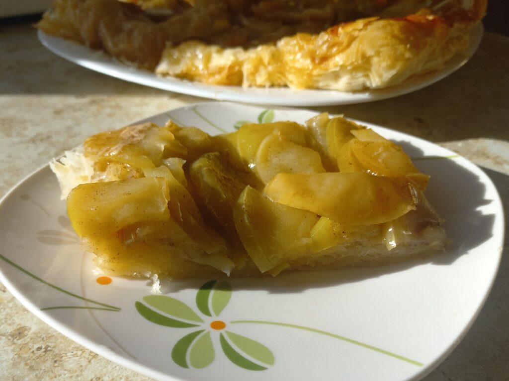 8. Наш идеальный, сочный, обалденный яблочный пирог на слоёном тесте с карамелизированной начинкой готов! Перед подачей нарезаем на кусочки.